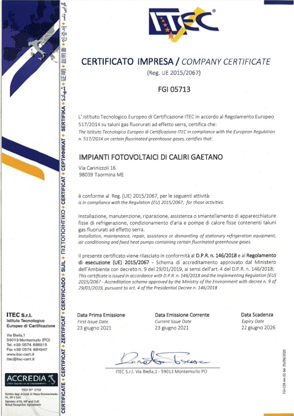 SERVIZIinstallazione di impianti fotovoltaici residenziali ed industriali installazione impianti di climatizzazione invernale azienda certificata F-gas al numero FGI05713sfoglia PDF ⤋