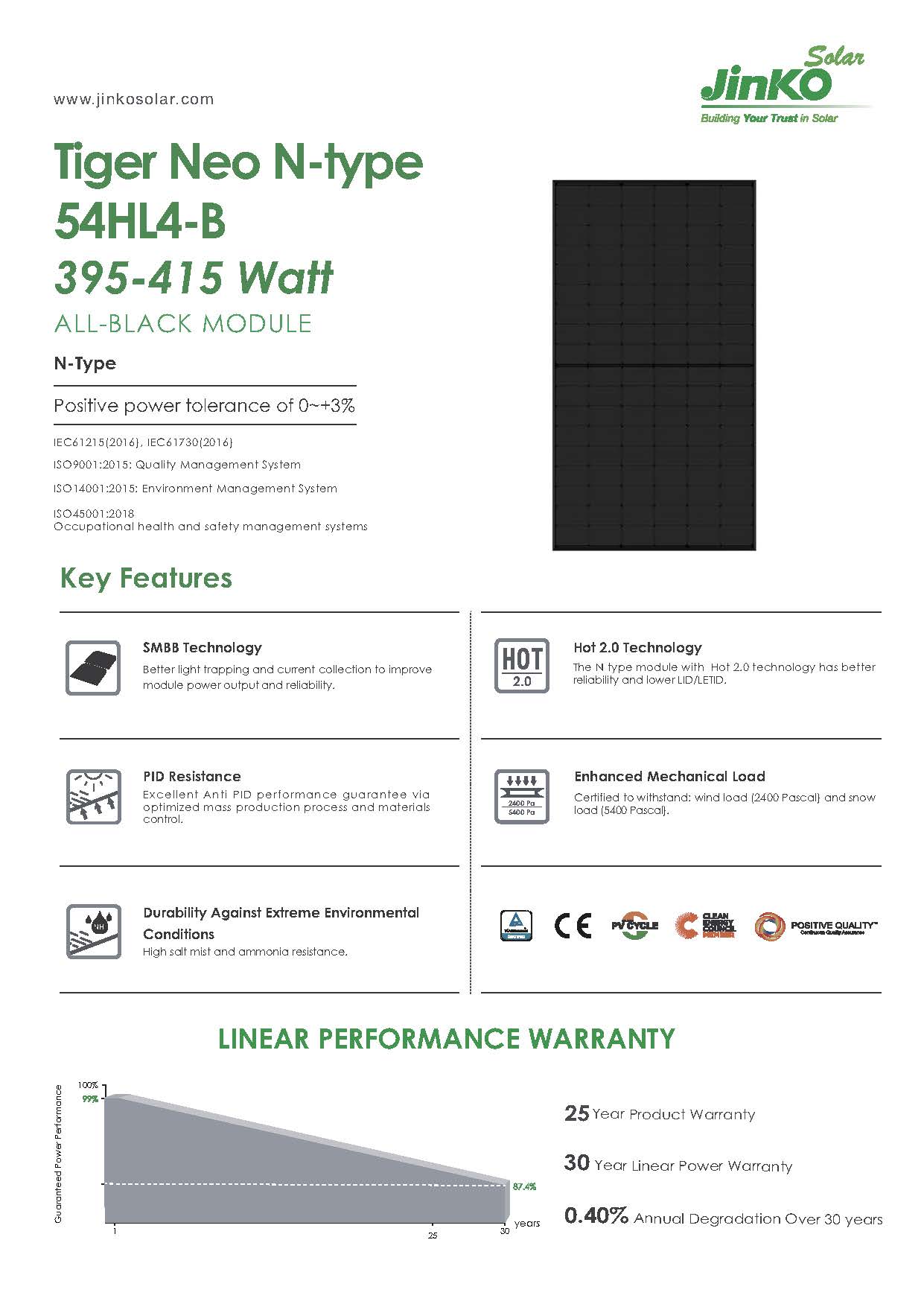 Tiger Neo N-type 54HL4-B 395-415 WattALL-BLACK MODULEPositive power tolerance of 0~+3% Download Visualizza 🖥️ Gallery ⇓